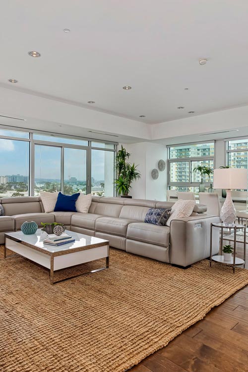 Welcome to Premier Lattitude Sky Collection, an exclusive condominium just 3 blocks from the beach. This 7th-floor penthouse offers luxurious features and breathtaking views of the city, marina, and channel. With abundant natural light, this home provides an unparalleled living experience. Step into a New York-style loft with an open floor plan, combining the living room, dining area, kitchen, and den seamlessly. With 10-foot ceilings and elegant hardwood floors, this residence exudes sophistication and style. The kitchen is a culinary masterpiece with custom white laminate cabinets, stone counters, and a tile backsplash. Equipped with top-of-the-line Subzero/Wolf appliances and an oversized island, it's a dream for epicureans. The primary bedroom is a grand haven of relaxation with panoramic views of the marina, ocean, and channel. Its spa-like bathroom features stone and tile, dual sinks, a separate tub, a shower, and a spacious walk-in closet. The second bedroom, converted into an office with water views, has its own bathroom. The third bedroom offers city views, ample closet space, and an en-suite bathroom, providing privacy for guests or family members. Designed by KAA Design Group just 12 years ago, this residence showcases modern architectural excellence. Its exceptional location offers unrivaled beach proximity and top-quality amenities. Residents enjoy two secure parking spaces, guest parking, a state-of-the-art gym, 24-hour security, and on-site management. The dedicated concierge ensures exceptional service.